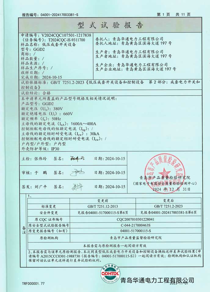 GCK低壓成套開關設備檢驗報告