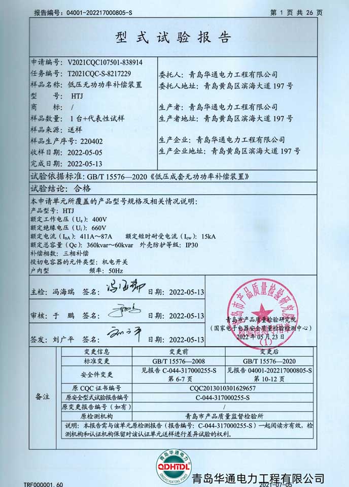 JP低壓綜合配電柜檢驗報告